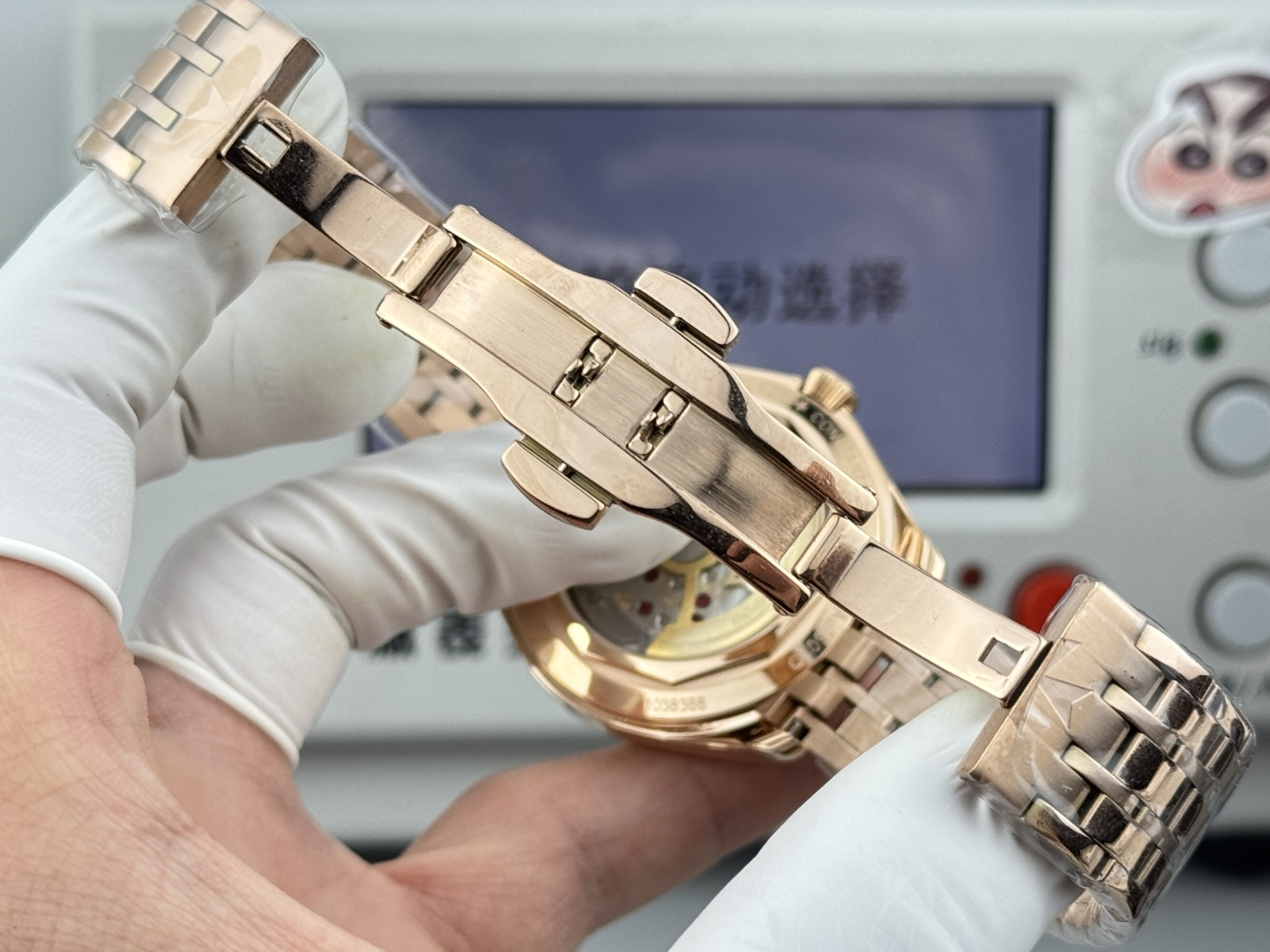 ブレスレットはケースと同じ18kローズゴールドメッ316Lステンレススチール製。コマ形状や厚みのバランスも良く、腕の動きに自然に追従します。ビジネスシーンはもちろん、カジュアル寄りの服装にも合わせやすい万能な仕上がりです。
