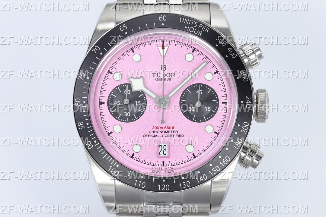 チューダーのブラックベイ クロノは、クラシックなダイバーズウォッチのDNAと現代的なクロノグラフ機能を兼ね備えた、まさに「チューダーの卒業作」と呼べる一本。ZF工場は、このモデルを正規品に限りなく近い仕様で再現し、特に日付表示の精度は市場で唯一無二です。日付窓のサイズ、数字のフォント、間隔まですべて本家と完全一致。